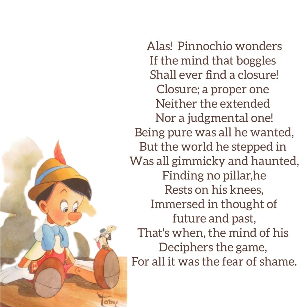 Alas! Pinocchio wonders If the mind that boggles Shall ever find a closure! Closure; a proper one Neither the extended Nor a judgmental one! Being…