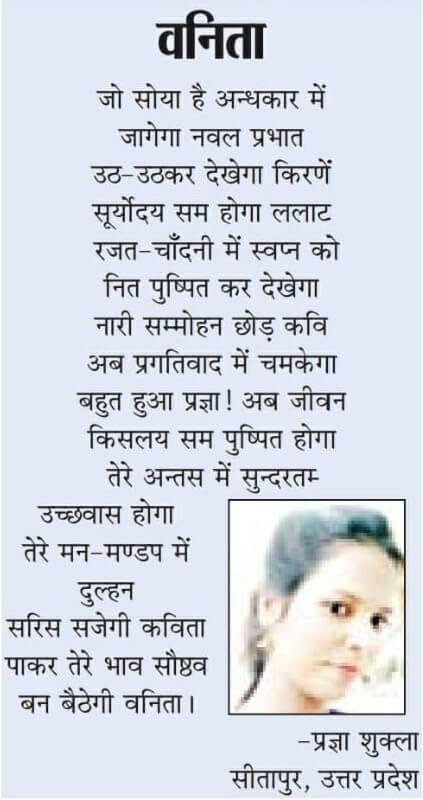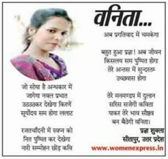 हाल ही में प्रज्ञा जी की कविता ‘वनिता’ को प्रेस में काफ़ी सराहना मिली। सावन परिवार प्रज्ञा जी के लिये कामना करता है कि उनको काव्य की दुनिया में हर दिन नई ऊंचाई और दिशा मिले।